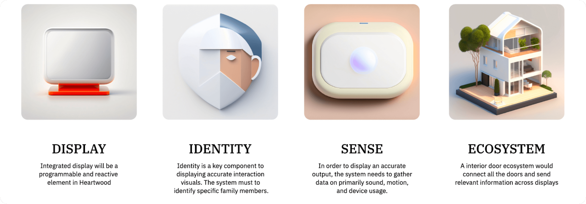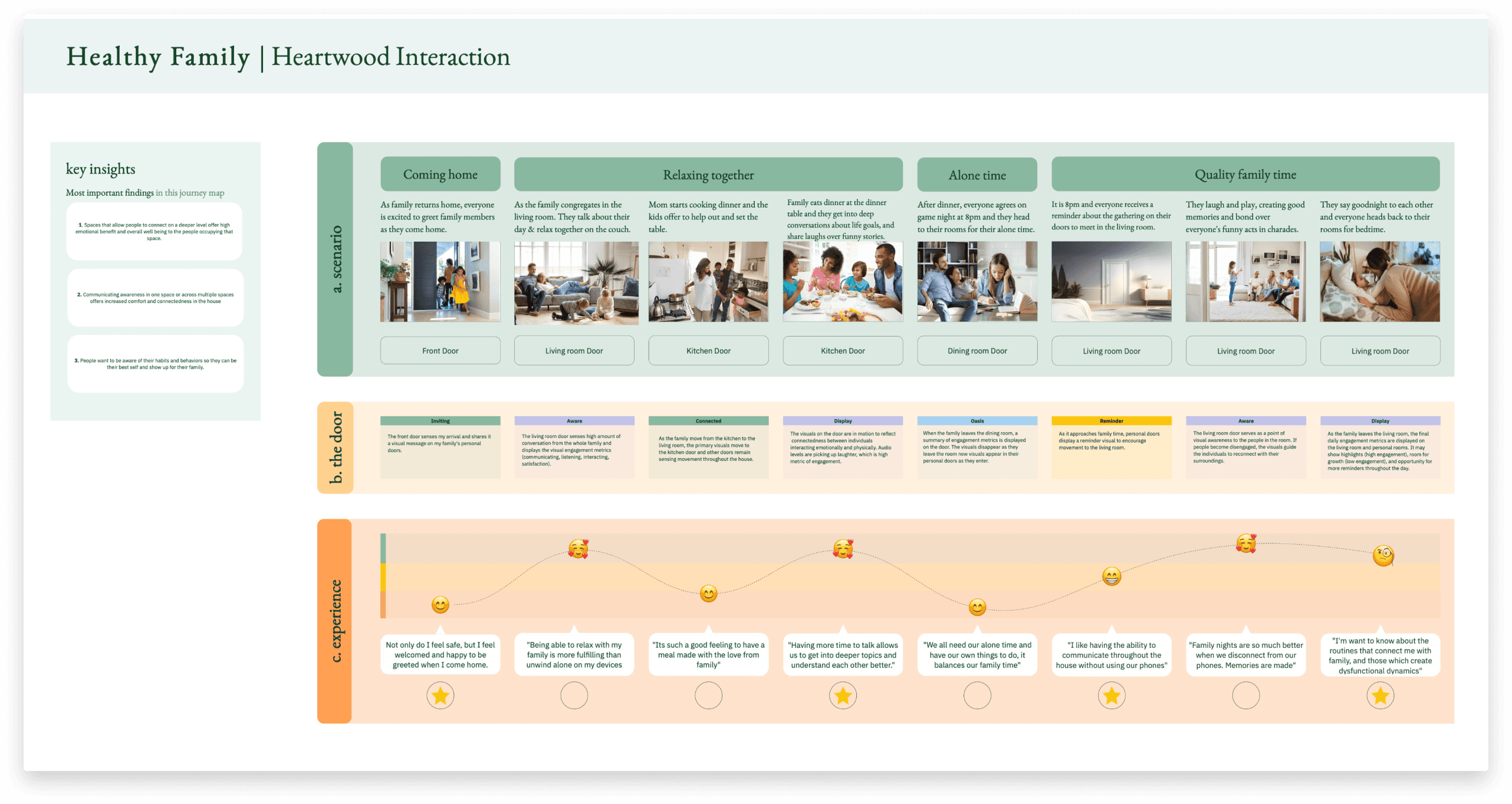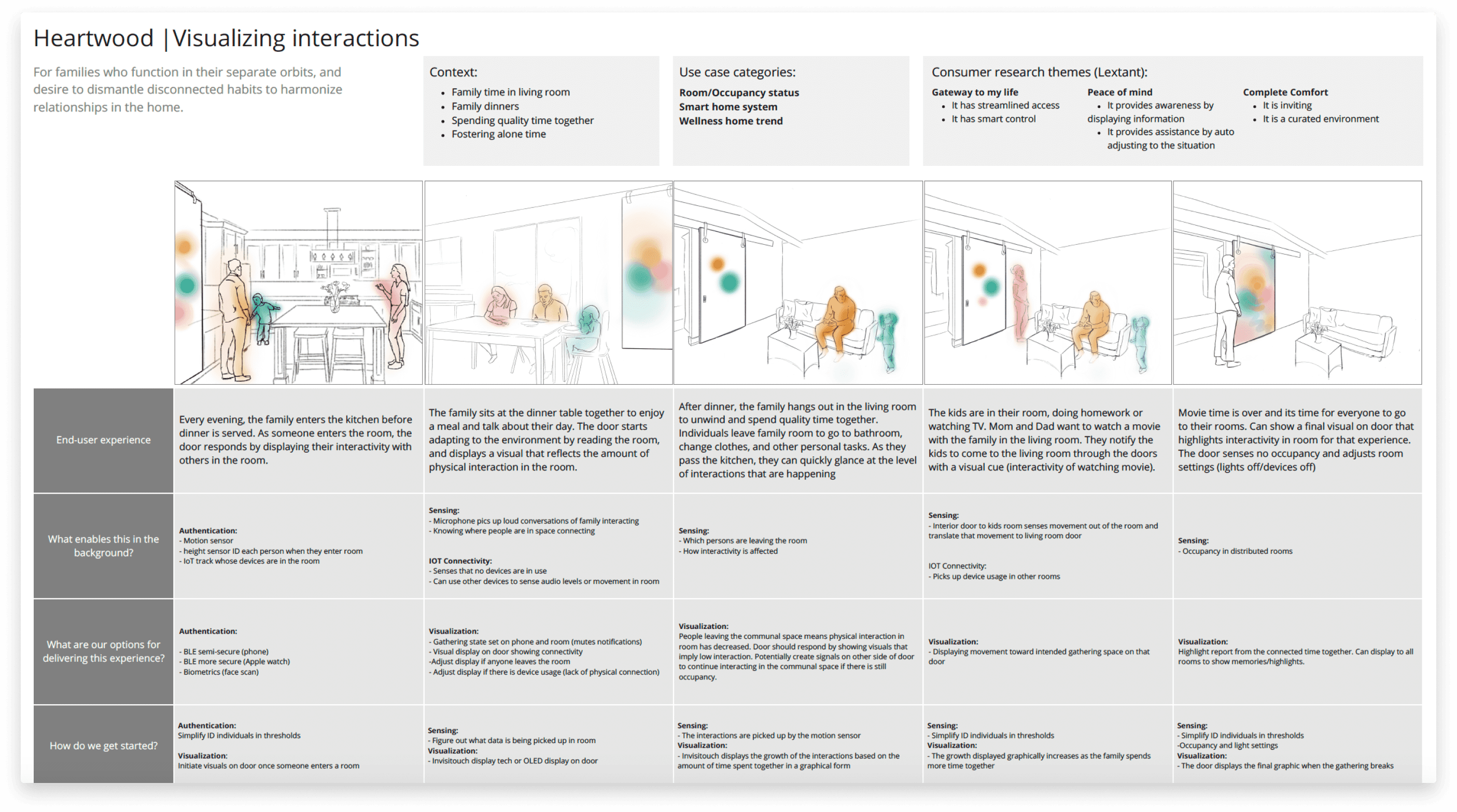 After much collaborative brainstorming, we've arrived at a concept for a door that can detect emotions and activities, displaying information to encourage interaction. While this may sound futuristic and abstract, I am excited to introduce you to the product "Heartwood" which brings this concept to life.