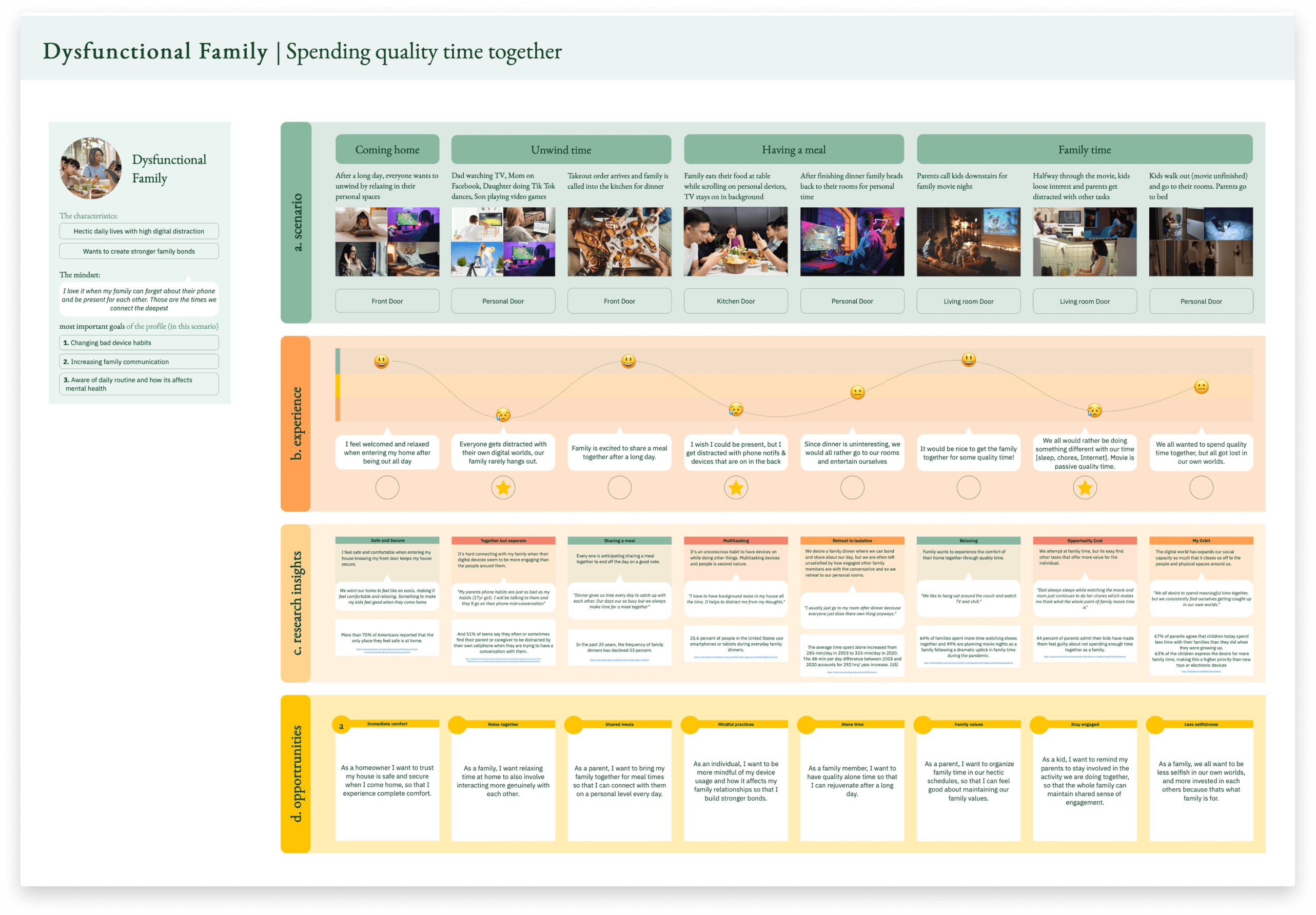 To understand the problem in detail, we drafted a journey map for a dysfunctional family and identified the shortcomings. We then plotted the journey map with Heartwood in action which results in healthy family interactions.